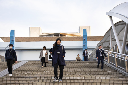 Tokyo, Japan - March 26, 2019 : Thai women and Japanese people and foreigners walking go to trains station after finished work at tokyo big sight in Ariake at Koto city