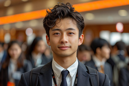 Young Asian male in suit smiling confidently at a professional event, surrounded by blurred attendees.
