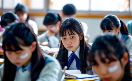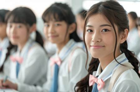 Asian Girls Education. Studying students children at school and university, classroom, auditorium, applicants school uniforms, fun at recess, happy little girls, studying science Student diversity