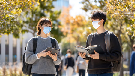 Generative AI : Portrait of a group of students covered by face masks New normal lifestyle concept with young people going to school