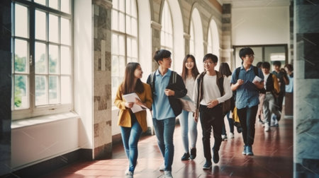 Group of positive Korean students on street portrait image, ai generated. Happy japanese friends walking together picture photorealistic photography. Urban lifestyle concept photo realistic