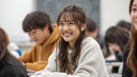 A young woman smiles warmly in a classroom setting, surrounded by classmates. The atmosphere is lively as students engage in their studies together.