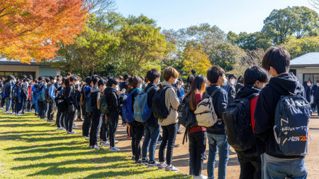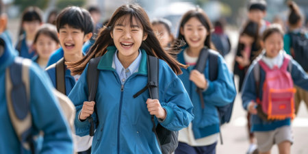Young japanese students group in spring park portrait image, ai generated. Happy asian friends with backpacks picture photorealistic photography. Youth active lifestyle concept photo realistic