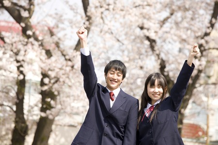 Young japanese students with school uniform bonding outdoors - Group of asian teenagers having fun
