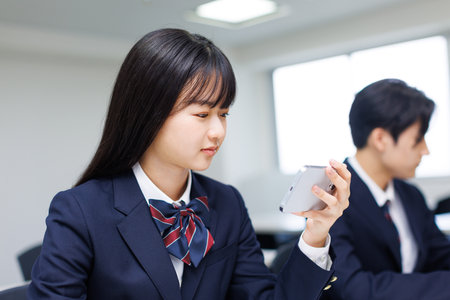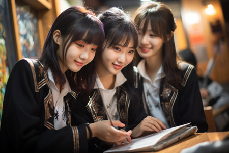 Four japanese high school students in uniform are working on a school project together, using laptops and taking notes