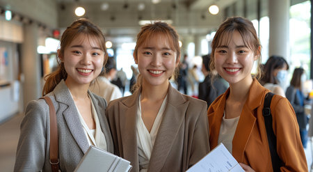 Three young Asian women smiling in a university hallway, holding books and wearing smart casual attire.