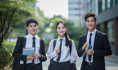Happy korean students standing together in college yard portrait image, ai generated. Young Asian people in warm clothes picture photorealistic photography. Lifestyle concept photo realistic