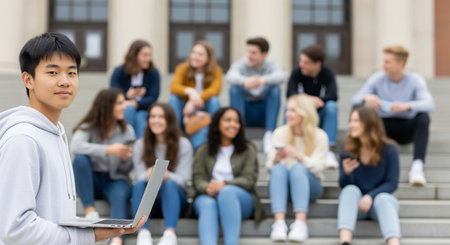 Young asian man holding a laptop standing on campus steps with diverse group of college students in background. concept of education, university life, learning environment.