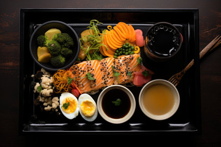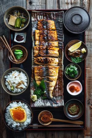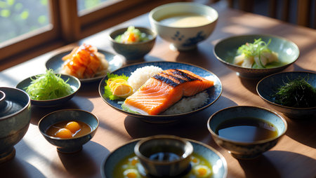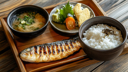 Enjoy a traditional Japanese breakfast featuring grilled fish, rice, miso soup, and fresh vegetables. A healthy and balanced meal to start your day.