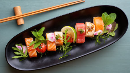 Exquisite sushi assortment arranged with colorful vegetables and garnishes on a modern green plate