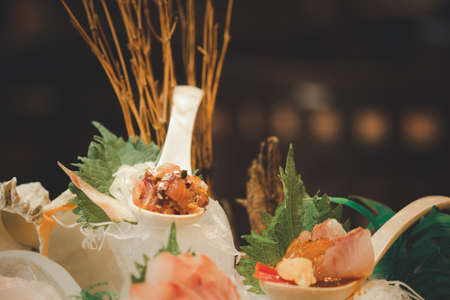 A set of Omakase fish sashimi premium set serve on ice. Japanese food style