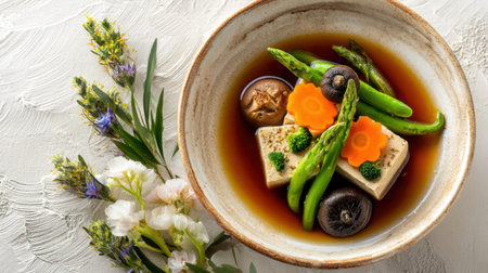 A vibrant vegetable and tofu dish featuring carrots, asparagus, and mushrooms in savory broth. Set against a textured background with delicate flowers, it evokes freshness and health.