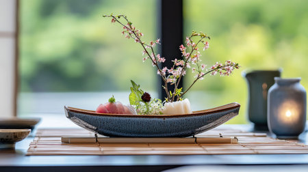 A perfectly crafted sashimi boat on a bamboo mat, enhanced with delicate plating, soft lighting, and ceramic dishes.