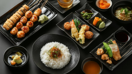 Experience the vibrant beauty of Japanese cuisine with a stunning arrangement of sushi, grilled skewers, and fresh vegetables, perfect for any meal.
