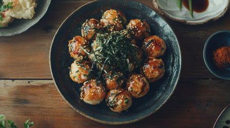 A beautifully arranged takoyaki dish placed on a wooden table, accompanied by chopsticks and traditional Japanese tea, creating a cozy and authentic dining experience