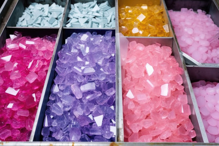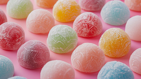 Macro shot of colorful hard candies with sparkling sugar crystals, captured in a bright and cheerful setting. Perfect for sweet and festive themes.