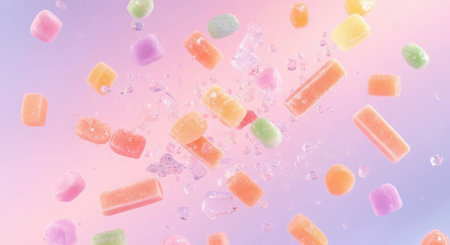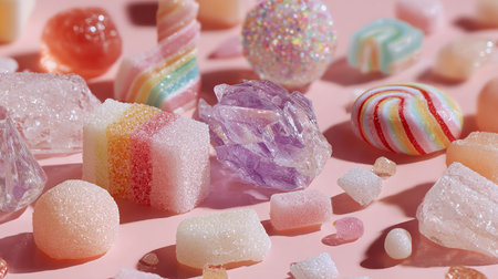 Assorted colorful candies creating a vibrant and sweet pattern on a pink backdrop, casting playful shadows that add depth and texture to the sugary arrangement