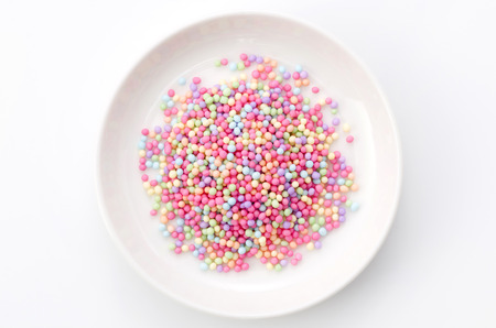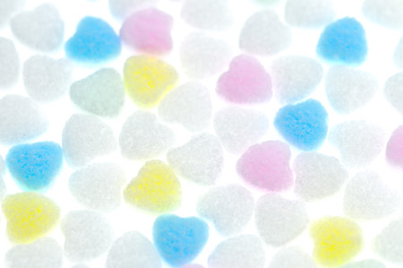Decorative sugar crystals in pastel colors, sprinkled over a white surface for a festive baking concept