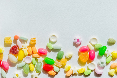 Assorted colorful candies on a white background. Top view.