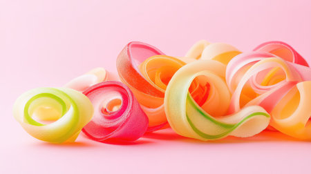Whimsical composition of pastel swirl ribbon candies neatly arranged on a playful pink surface