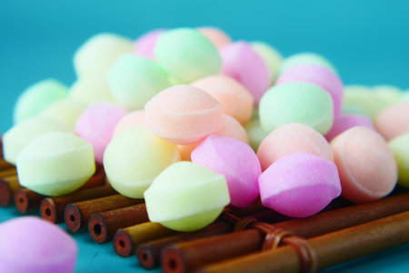 colorful jelly candies on blue background, close up, shallow dof