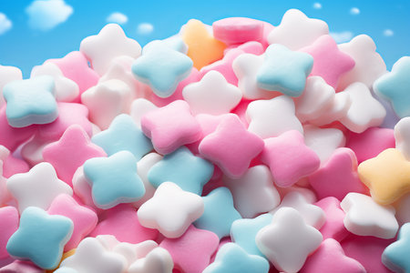 A vibrant assortment of star-shaped candies in various pastel colors creates a playful and inviting display, perfect for celebrations or sweet treats, set against a bright sky-like backdrop.