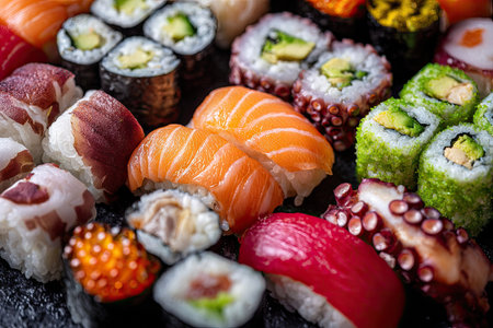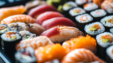 Close-up of a beautifully arranged sushi platter with various types of sushi, including nigiri, sashimi, and rolls, showcasing vibrant colors and fresh ingredients.