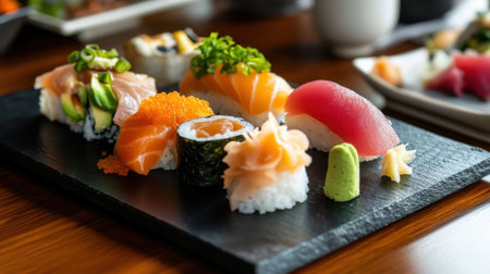 A close-up of sushi artfully arranged on a sleek black plate, with wasabi and pickled ginger adding pops of color.