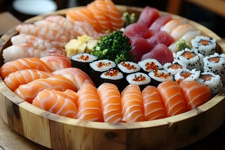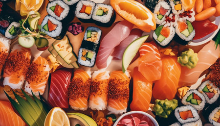 Fresh seafood meal with sushi variation, cultures and healthy eating generated by artificial intelligence