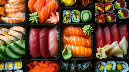 a classic japanese bento box featuring an array of sushi pieces arranged elegantly on a wooden table for a traditional sushi presentation