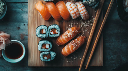 A gourmet Japanese sushi platter with a variety of fish, perfectly arranged on a wooden board, minimalist design