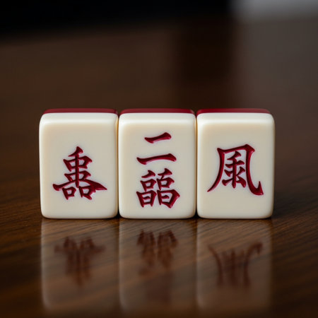 A tightly framed, square-format (1:1) cinematic depiction of three antique Mahjong tiles forming a p