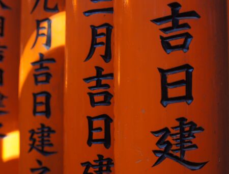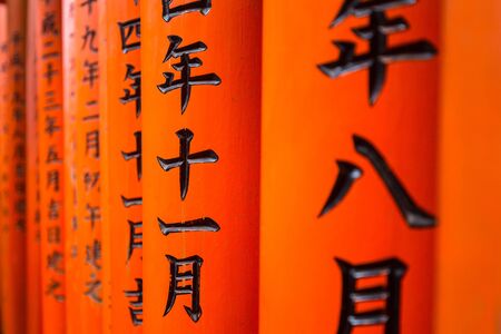 Japan, writing and wood with Japanese, spiritual and pillars with sign on a urban road outdoor. Travel, path and Asian culture with ancient structure with history in Hanamikoji Street in Kyoto