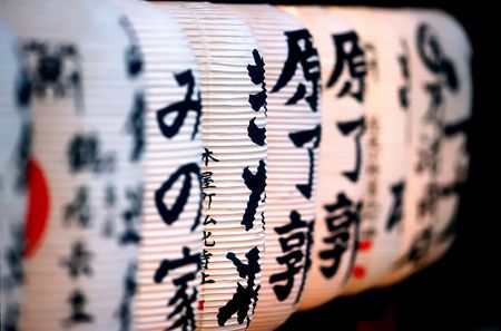 Kanji-covered lanterns at a temple in Kyoto, Japan.