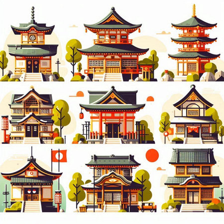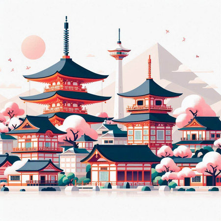 Landscape of traditional japanese buildings. Vector illustration in flat style.