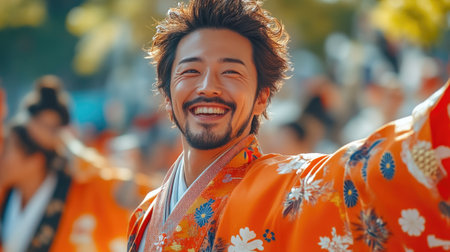 Elegant Man in Kimono Expressing Joy Through Dance