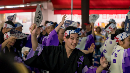 Tokyo, Japan - August 2018: Japanese performers dancing traditional Awaodori dance in the famous Koenji Awa Odori festival.