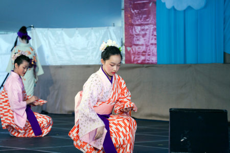 Hokkaido, Japan - 28 December 2017 - Japanese local performers in traditional Japanese dress perform traditional local Japanese style dance for hotel guests at Eclipse hotel in Hokkaido, Japan on December 28, 2017
