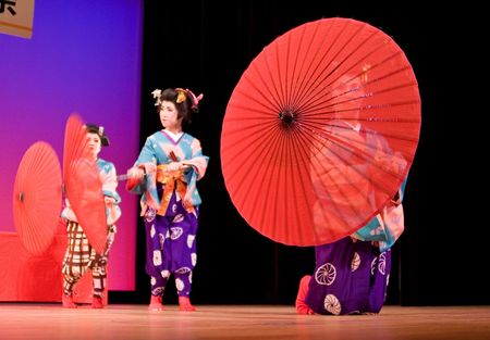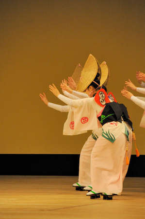 Kagoshima City, Japan, October 27, 2007. Japanese dancers in traditional costume perform with umbrellas onstage in the Taniyama Furusato Matsuri festival held in Kagoshima City, Japan.
