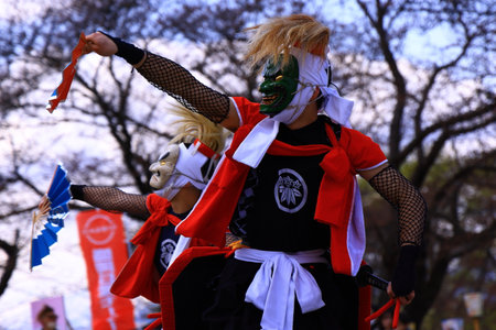 Columbus, Ohio, USA - May 26, 2019: Columbus Asian Festival, Members of Takarabune dance group from Japan, wearing traditional clothing performing traditional dances at the Amphitheater in the Franklin Park.