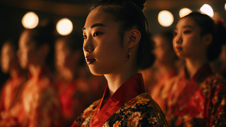 Cheerful Young Woman in Traditional Kimono Smiling Amongst Friends at Cultural Festival Gathering AI Generative