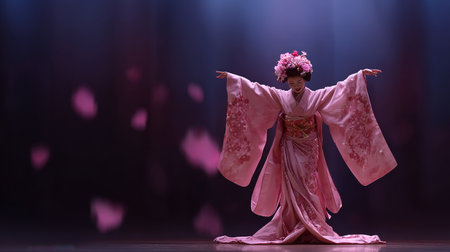 A dancer in traditional Japanese attire showcases elegant movements, creating a striking silhouette against a clean white background.
