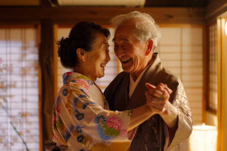 A happy Japanese elderly couple, husband and wife, gleefully dance in their home's warm ambiance, enjoying each other's company and creating lasting memories of joy and affection.