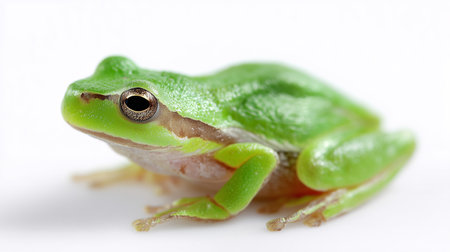 A close-up portrait of a vibrant green tree frog, isolated against a clean white background, showcasing its smooth skin and large eyes.