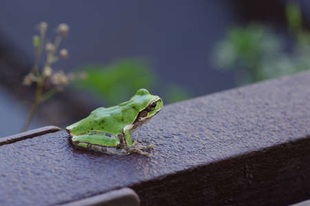 Green Tree Frog (Hyla arborea) sitting on a wooden box