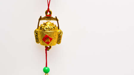 Hanging wealth pot pendant for Chinese New Year celebration against white surface