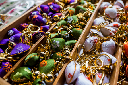 Traditional japan necklaces, handmade souvenirs at marketplace.