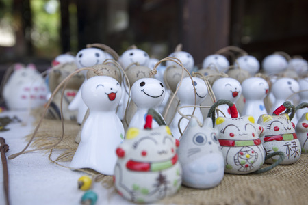 Japanese traditional japanesse porcelains products on a blurred background mass-produced products. Selective focus in a store in hanami Kyoto