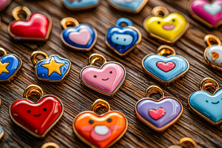 Bright, playful charms featuring smiling faces and vibrant heart shapes are arranged on a rustic wooden backdrop, evoking cheerful charm and whimsy.