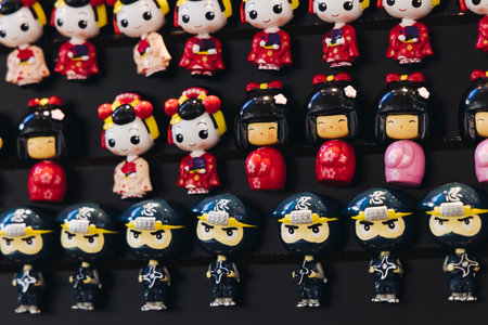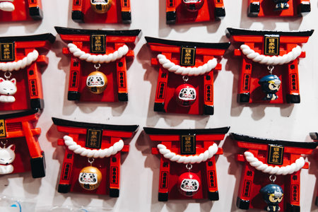 Traditional Japanese tourist souvenirs and gifts from Kyoto, Kansai, Japan, with daruma figures, kitsune fox, tengu mask, refrigerator magnets, toys figurines, key ring keychain, in a local vendor gift shop